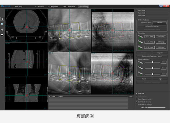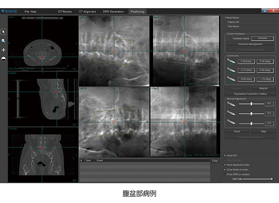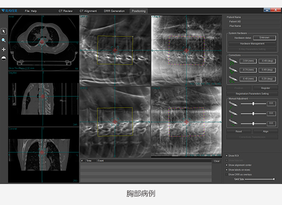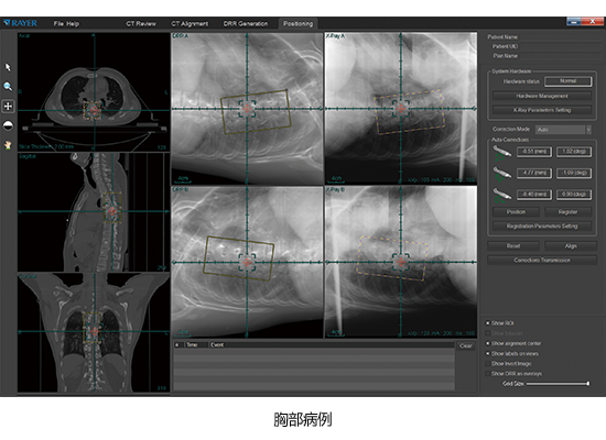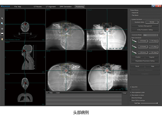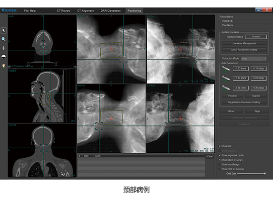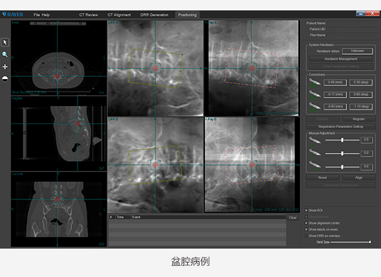產品采用kV級X射線立體平面成像技術,通過軟件控制兩組對稱于定位中心點的X射線成像單元,獲得兩個方向的X射線投影圖像,利用患者內部解剖結構的圖像特征,進行X射線圖像和CT圖像的二維-三維圖像配準,對患者進行擺位驗證。產品與放療設備組合使用,探測、糾正患者擺位誤差,并驗證患者最終剩余擺位誤差。
